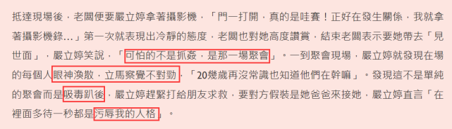灵机一动,严立婷决定打电话给朋友求助,让对方假装自己的父亲要来接她回家,严立婷才正式脱险,她表示:“在里面多待一秒都是污辱我的人格!”