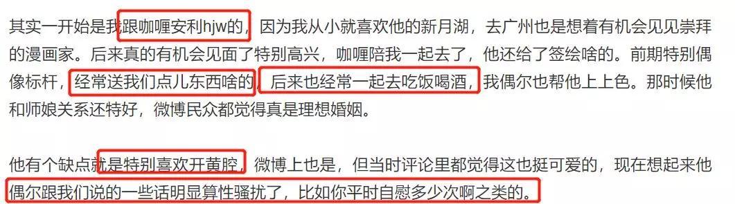 好友开篇就提到,杜雨微(文中的咖喱)是通过自己介绍和黄嘉伟认识的,后续黄嘉伟还送了她们礼物,也经常一起去吃饭喝酒;相处过程中发现黄嘉伟非常喜欢开黄腔,当时还有不少人觉得可爱,现在回想起来很多言语已经属于性骚扰。