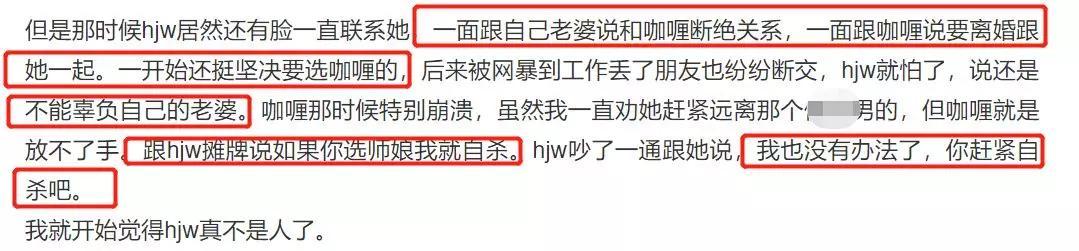 如今好友的长文里又继续补充了更多细节,原来黄嘉伟和杜雨微并没有马上断绝关系,一开始黄嘉伟还很坚定地要和原配分手,只是发现后果严重,就反悔了。