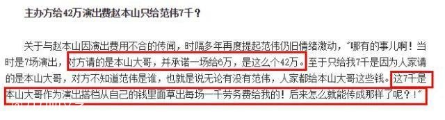 但范伟坚决否认了这个说法,他对媒体说:“哪有的事儿!对方请的是本山大哥,无论有没有范伟,人家都给本山大哥这些钱,这7000是本山大哥从自己的钱里面按照每场1000的劳务费给我的。”