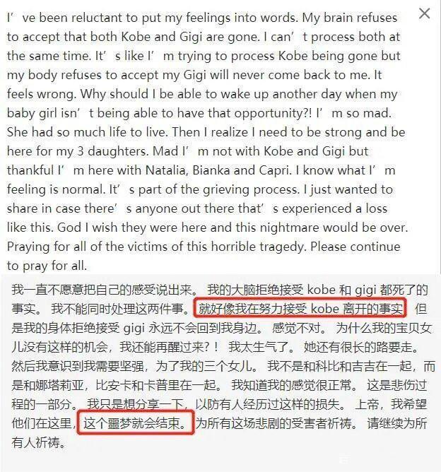 自科比与瓦妮莎的女儿吉安娜在美国时间1月26日去世之后,瓦妮莎几门就消失于公众的事业中,只是独自在社交网上悼念自己的丈夫与女儿。后来虽然她出席了吉安娜的2号球衣退役仪式,但从她此次发文的言语来看,她依旧没有说服自己去接受丈夫和女儿永远离开的事实。