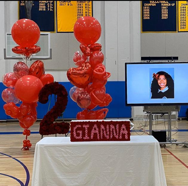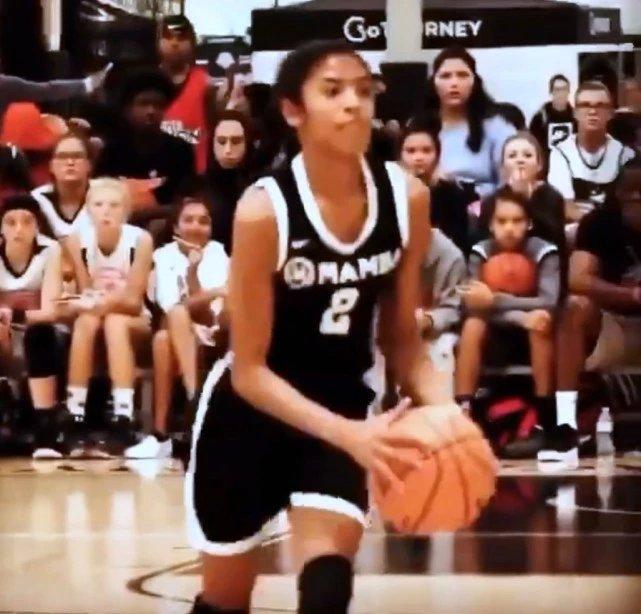 在视频封面,吉安娜穿着一件深色的运动夹克,和队友一起开怀大笑着,一头卷发配上利落的高马尾造型看上去十分的阳光。而球场上吉安娜身穿深色的2号球衣,黑白相间的篮球服完美的展现出吉安娜修长的身材,在教练科比的指导下动作十分出色。