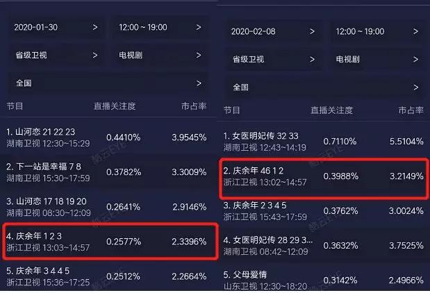 而其对于《庆余年》,更是采取了轮播方式,播完最后一集接着又是第一集,完全不用担心范闲下线。不过神奇的是就算如此操作,浙江卫视的收视居然没有下降,还上升了不少。