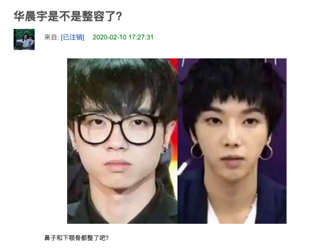 所谓树大招风,随着华晨宇夺魁之后,除了有人对他的歌唱表示质疑之外,还有网友将关注的重点转移到了他的脸上。2月10日,有网友在某论坛上贴出了华晨宇早年的照片和近照作对比,并提出质疑:“华晨宇是不是整容了?鼻子和下颚骨都整了吧?”