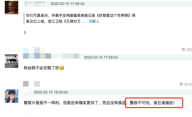 面对网友的质疑,华晨宇粉丝表示这其实是华晨宇一路坚持减肥才导致的。也有耿直的粉丝直接回击:“整容不可怕,谁丑谁尴尬!”还有粉丝表示:“整容了我也喜欢他,长残了我也喜欢他。”