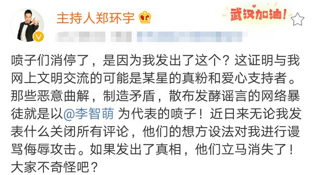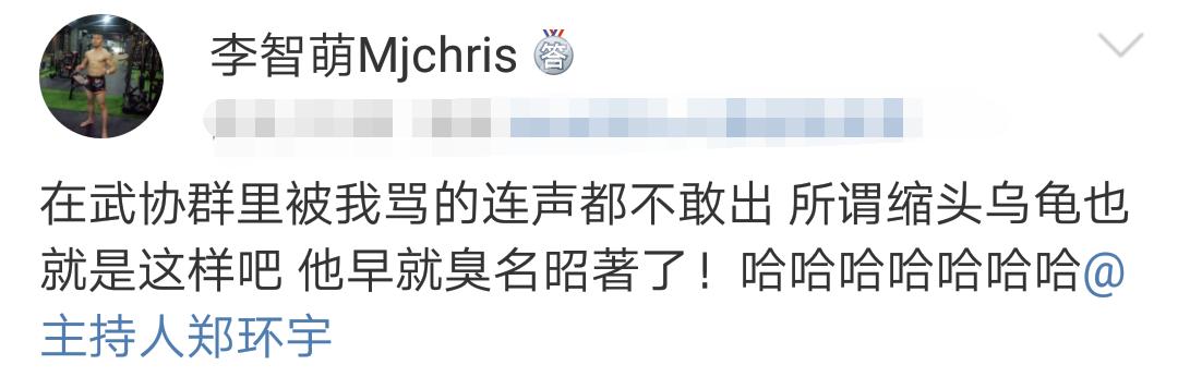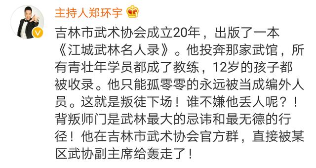 郑环宇还补充道:“吉林市武术协会成立20年,出版了一本《江城武林名人录》。他投奔那家武馆,所有青壮年学员都成了教练,12岁的孩子都被收录。他只能孤零零的永远被当成编外人员。这就是叛徒下场!谁不嫌他丢人呢?!背叛师门是武林最大的忌讳和最无德的行径!他在吉林市武术协会官方群,直接被某区武协副主席给轰走了!喷子们消停了,是因为我发出了这个?这证明与我网上文明交流的可能是某星的真粉和爱心支持者。那些恶意曲解,制造矛盾,散布发酵谣言的网络暴徒就是以李智萌 为代表的喷子!近日来无论我发表什么关闭所有评论,他们的想方设法对我进行谩骂侮辱攻击。如果发出了真相,他们立马消失了!大家不奇怪吧? ”