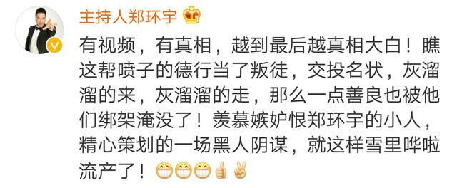 在发布完这段视频后,郑环宇得意地表示:“有视频,有真相,越到最后越真相大白!瞧这帮喷子的德行当了叛徒,交投名状,灰溜溜的来,灰溜溜的走,那么一点善良也被他们绑架淹没了!羡慕嫉妒恨郑环宇的小人,精心策划的一场黑人阴谋,就这样雪里哗啦流产了!李智萌的四十九条谣言不攻自破!看你也到而立之年要结婚,生子白,也当教练带着几个孩子,本来给你想留点后路,但你为了当叛徒递头名状已经毫无底线了,这是给你第一个教训!”