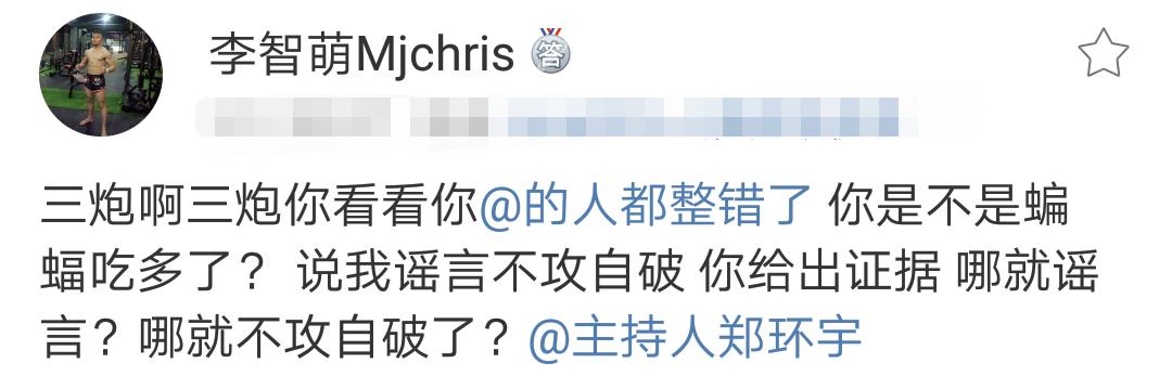 对此,李智萌也回应道:“三炮啊三炮你看看你艾特的人都整错了,说我谣言不攻自破,你给出证据,哪就谣言?哪就不攻自破了?你给全国7000多看直播的武友展示了你三四楼那么高的个人素质,并且讲授了如何隔着屏幕把人的耳朵震聋,作为一个所谓练武的,被人上门挑战,连应战的勇气都没有,到底是谁丢人,大家看清楚。在武协群里被我骂的连声都不敢出,所谓缩头乌龟也就是这样吧,你早就臭名昭著了!大家是没见过他真人,要不你也得揍他,他从小到大因为嘴贱挨过太多揍了。”
