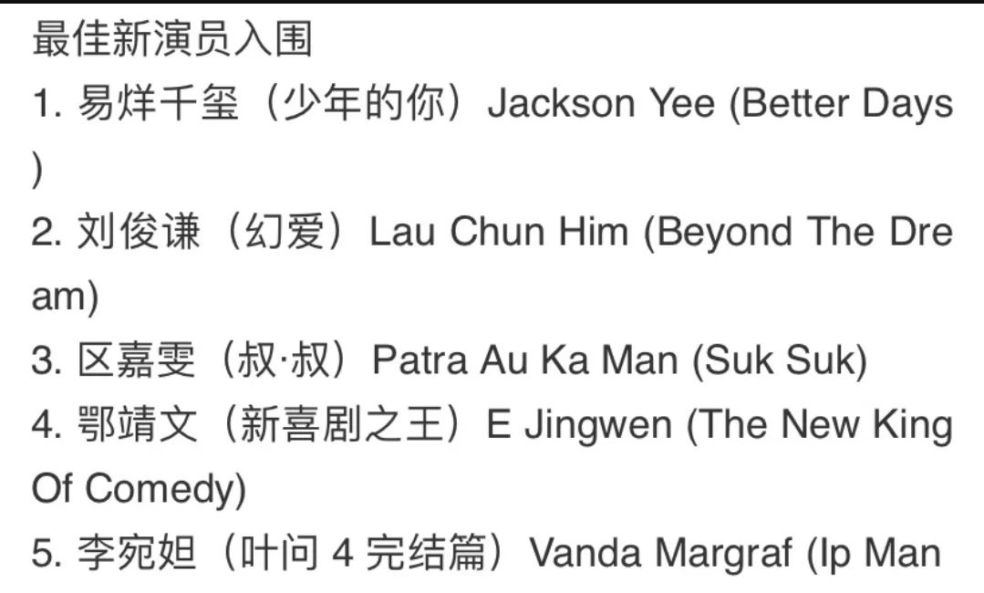 今天金像奖主办方官宣了入围名单,其中易烊千玺入围金像奖最佳男主角和最佳新人演员。