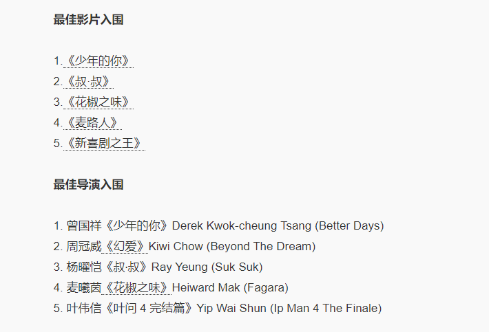 最佳影片提名中,除了《少年的你》一部爆款外,《叔·叔》和《麦路人》都是名不见经传的香港本土电影,怎么看都像是本土电影为了存在感而硬凑上来的。而《花椒之味》和《新喜剧之王》在线观看(✪ω✪)都是两岸合拍片,口碑表现平平,特别是《新喜剧之王》可以说是周星驰导演生涯中最差作品,能入围最佳影片不得不让人质疑金像奖的含金量。