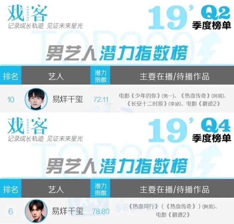 我们每季度根据演员的在播待播作品量级、角色量级等维度科学计算出的戏客潜力榜上,也时常看到易烊千玺用作品刷新着自己的实力,潜力指数在竞争激烈的男艺人潜力榜中位列TOP10。