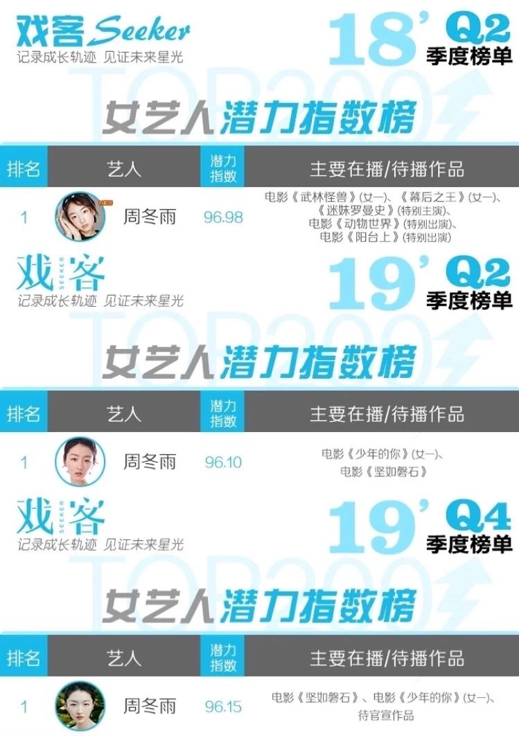 从2018年到2019"Q4,周冬雨就一直稳居戏客潜力榜女艺人TOP1,这一次看到她的入围,不仅为她一路踏实走出的实绩开心,更期待接下来她能带给观众更多的惊喜~(连续多季度获得女艺人潜力指数榜第1名)女主角的提名名单里还有不容忽视的一位就是郑秀文,这一季她参与的两部作品——《花椒之味》和《圣荷西谋杀案》,都参与了本次大奖的评选。