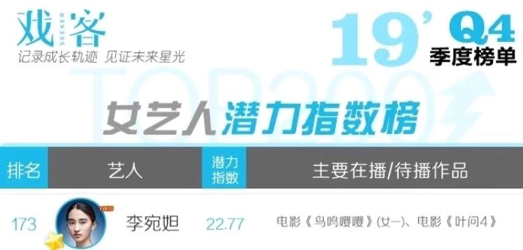 此前2019年第四季度的戏客潜力榜单中,李宛妲就已经是标星特别关注艺人,此次金像奖新人奖的提名也印证了我们对她的潜力分析。