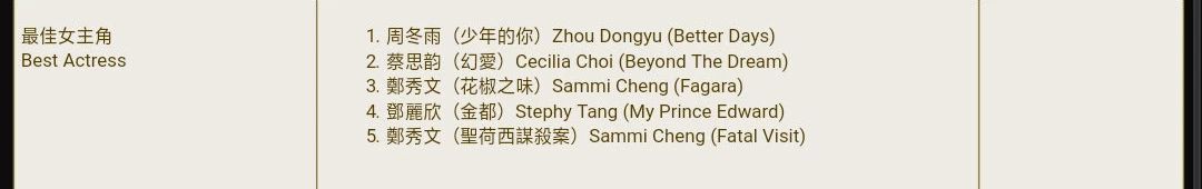 (以下为完整入围名单,较长,请您缓速下滑~)最佳影片入围1.《少年的你》2.《叔·叔》3.《花椒之味》4.《麦路人》5.《新喜剧之王》在线观看(✪ω✪)最佳导演入围曾国祥(少年的你)周冠威(幻爱)3. 杨曜恺(叔‧叔)4. 麦曦茵(花椒之味)5. 叶伟信(叶问 4 完结篇)最佳编剧入围1. 林咏琛、李媛、许伊萌(少年的你)2. 曾俊荣、周冠威(幻爱)3. 杨曜恺(叔‧叔)4. 麦曦茵(花椒之味)5. 黄绮琳(金都)最佳男主角入围1. 易烊千玺(少年的你)2. 古天乐(犯罪现场)3. 太保(叔‧叔)4. 朱栢康(金都)5. 郭富城(麦路人)最佳女主角入围1. 周冬雨(少年的你)2. 蔡思韵(幻爱)3. 郑秀文(花椒之味)4. 邓丽欣(金都)5. 郑秀文(圣荷西谋杀案)最佳男配角入围1. 姜皓文(犯罪现场)2. 卢镇业(叔‧叔)3. 张达明(麦路人)4. 万梓良(麦路人)5. 张琪(新喜剧之王)最佳女配角入围1. 区嘉雯(叔‧叔)2. 赖雅妍(花椒之味)3. 鲍起静(金都)4. 刘雅瑟(麦路人)5. 蔡卓妍(圣荷西谋杀案)最佳新演员入围1. 易烊千玺(少年的你)2. 刘俊谦(幻爱)3. 区嘉雯(叔‧叔)4. 鄂靖文(新喜剧之王)5. 李宛妲(叶问 4 完结篇)最佳摄影入围1. 余静萍(少年的你)2. 司徒一雷(幻爱)3. 谢忠道(犯罪现场)4. 叶绍麒(花椒之味)5. 郑兆强(叶问 4 完结篇)最佳剪接入围1. 张一博(少年的你)2. 罗永昌、邹耀衡(犯罪现场)3. 张叔平、陈序庆(叔‧叔)4. 张叔平、钟家骏(金都)5. 张嘉辉(叶问 4 完结篇)最佳美术指导入围1. 梁鸿鹄(少年的你)2. 陈七(犯罪现场)3. 张兆康(花椒之味)4. 文念中、利国林(麦路人)5. 麦国强(叶问 4 完结篇)最佳服装造型设计入围1. 吴里璐(少年的你)2. 潘燚森(叔‧叔)3. 张兆康(花椒之味)4. 文念中、陈宝欣(麦路人)5. 利碧君(叶问 4 完结篇)最佳动作设计入围1. 黄伟亮(犯罪现场)2. 钱嘉乐、钱家班、黄伟辉、邓瑞华、吴海堂(使徒行者 2 谍影行动)3. 董玮(征途)4. 韩平、吴海堂(扫毒 2 天地对决)5. 袁和平(叶问 4 完结篇)最佳原创电影音乐入围1. 贝尔(少年的你)2. 波多野裕介(花椒之味)3. 林二汶(金都)4. 金培达(麦路人)5. 川井宪次(叶问 4 完结篇)最佳视觉效果入围1. 潘国瑜(中国机长)2. 谭启昆、吴家龙、钟家豪、杨起超(使徒行者 2 谋影行动)3. 徐建、魏明、李帅(征途)4. 黄宏达(烈火英雄)5. 余国亮、马肇富、梁伟民、何文洛(扫毒 2 天地对决)新晋导演入围1. 文伟鸿(使徒行者 2 谍影行动)2. 黄绮琳(金都)3. 黄庆勋(麦路人)4. 梁国斌(狮子山上)5. 卓翔(戏棚)