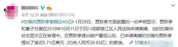 一时之间,网上议论纷纷,“甘薇向贾跃亭索赔40亿”也登上了微博热搜。