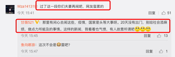很快,甘薇的微博下方就引来了不少网友的围观,网友各抒己见地发表评论,甘薇也在评论下方回复了部分网友的问题。有网友评论称:“过了这一段你们夫妻再闹吧,网友蛮累的。”面对网友的质疑,甘薇并没有回怼而是耐心地解释是有人故意为之,并且表示自己心系疫情,为了不给社会添麻烦,已经二十天没有出门了。