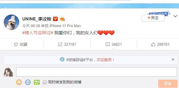 首先,李汶翰发了条微博,对自己的粉丝称,我爱你们,我的女人们