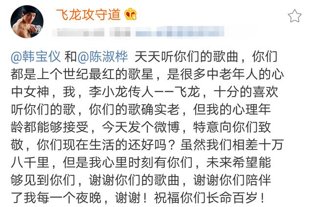 随即,他又向韩宝仪和陈淑桦两位老牌女歌星表达了赞美:“韩宝仪和陈淑桦,天天听你们的歌曲,你们都是上个世纪最红的歌星,很多中老年的心中女神,我,李小龙传人——飞龙,十分的喜欢听你们的歌,你们的歌确实老,但我的心理年龄能够接受,今天发个微博,向你们致敬,你们现在生活的还好吗?虽然我们相差十万八千里,但是我心里时刻有你们,未来希望能够见到你们,谢谢你们的歌曲,谢谢你们陪伴了我每一个夜晚,谢谢!祝福你们长命百岁!”