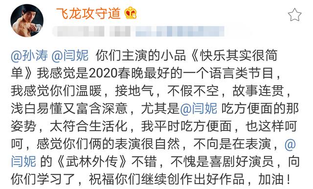 飞龙首先盛赞了闫妮和孙涛在春晚的完美表现,同时对闫妮出众的演技予以褒奖:“孙涛、闫妮,你们主演的小品《快乐其实很简单》我感觉是2020春晚最好的一个语言类节目,我感觉你们温暖,接地气,不假不空,故事连贯,浅白易懂又富含深意,尤其是闫妮吃方便面的那姿势,太符合生活化,我平时吃方便面,也这样呵呵,感觉你们俩的表演很自然,不向是在表演,闫妮的《武林外传》在线观看(✪ω✪)不错,不愧是喜剧好演员,向你们学习了,祝福你们继续创作出好作品,加油!”