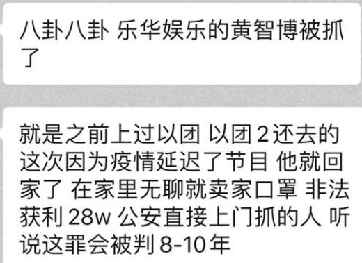 黄智博在网上贩卖口罩,骗取定金获取不义之财。这个消息刚在网上爆出的时候,他在微博有18万粉丝,他的粉丝就在网上为他洗白,说他是1999年11月18日出生的,网上爆出的信息确实1998年10月1日出生的。原来他是要参加《以团之名2》了,因为年纪过大,他的公司就为他改小了年龄,好让他能在一众小鲜肉中脱颖而出。没想到黄智博自己作死,没有道德底线,为了钱,为了满足自己的欲望竟然脑门热发起了国难财,最终辜负了乐华公司对他的期望。