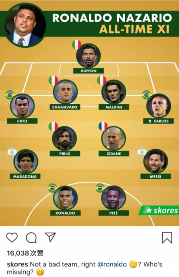 最近大罗在自己的社交平台上晒出了一张他心目中的历史最佳阵容,在大罗的这份历史最佳榜单中我们看到了梅西但是却没看到C罗。所以关于大罗这份最佳阵容就引起了球迷一片广泛的热议,尤其是没能入选最佳阵容的C罗让很多C罗球迷感到不满,甚至有C罗球迷直接叱责大罗:小心眼!