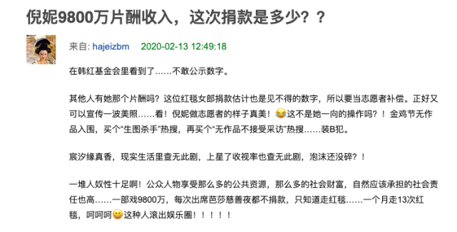 刚被批评完事业没成绩没作为,2月13日,又有网友发帖谴责:“倪妮9800万片酬收入,这次捐款是多少?”让人不得不感叹一句真是屋漏偏逢连夜雨。很明显网友这两次的话题对倪妮都很不利,也不知是不是倪妮流年不利,突然就被网友拉出来进行抨击。该网友嘲讽道:“其他人有她那个片酬吗?这位红毯女郎捐款估计也是见不得的数字,所以要当志愿者补偿。正好又可以宣传一波美照,看!倪妮做志愿者的样子真美!”