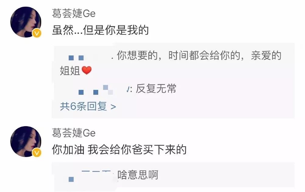 不仅如此,葛荟婕还在该条微博底下的评论上留言了两条让人浮想联翩的话语。一条是“虽然...但是你是我的”,另一条是“你加油,我会给你爸买下来的”。前一句似乎在宣誓女儿是自己的一般,对象疑似是说女儿,后一句直接扬言要花钱买下什么东西给汪峰。