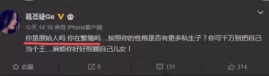 葛荟婕还特地翻牌了一个夸小苹果和她长得像的评论,但却答非所问,表示“用胚胎生了一个儿子”。这如此直白的内涵也太猖狂了点,赤裸裸的在暗讽章子怡是用人工受孕才生了儿子。