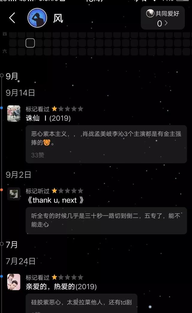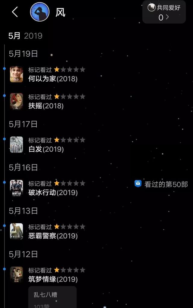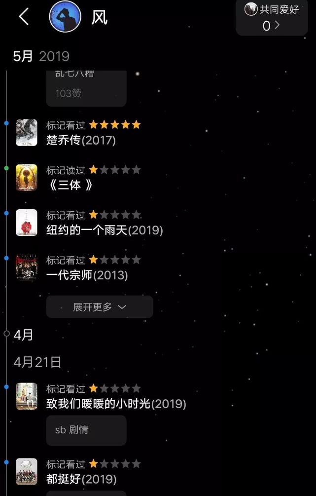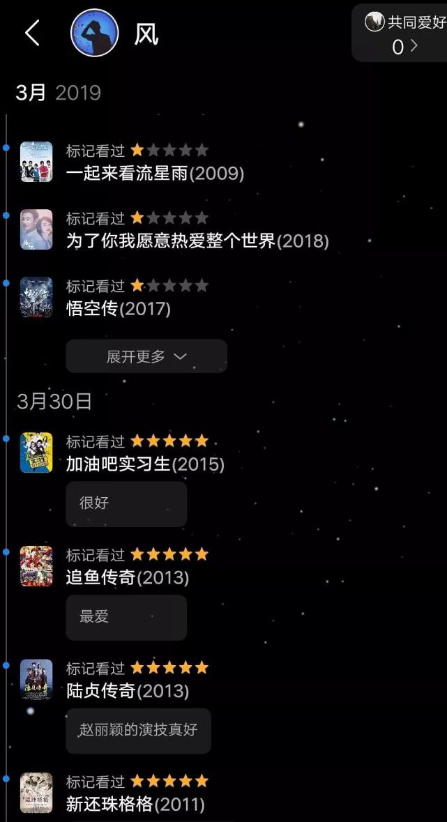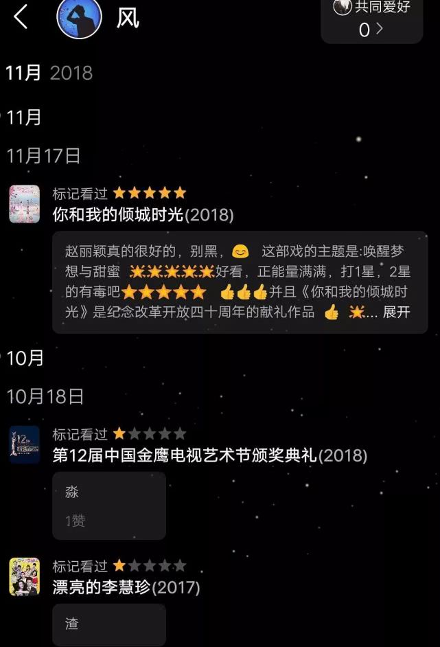 翻开“风”的观影记录,发现他除了给赵丽颖的所有影视剧5星好评以外,其他剧都不留情面全打1星,包括张雪迎的《白发》在线观看(✪ω✪),杨紫的《亲爱的,热爱的》在线观看(✪ω✪),肖战李沁的《诛仙》在线观看(✪ω✪),杨幂的《扶摇》在线观看(✪ω✪),甚至连其他好评如潮的影视剧,他也只给1星。