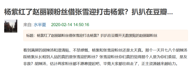 本着求真务实的态度,该网友开始疯狂扒皮网友“风”。神奇的一幕发生了,“风”发出的帖子除了诋毁杨紫、为张雪迎正名以外,居然还有帖子内容是黑杨幂捧赵丽颖的!