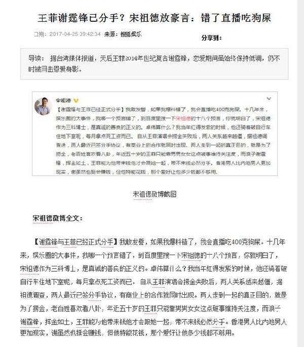 不仅如此,宋祖德还对自己的豪赌做了理性分析,虽然这个爆料不涉及劲爆的情色出轨等重磅新闻,却很犀利。除了下了重口味赌博,还拿出了自己的资历,顺便把最近很火的卓伟踩了一脚。还列举了之前成功爆料的事件为自己进行信用担保。更犀利地对王菲谢霆锋的关系进行体无完肤的分析,指出两人的感情背后更多是利益关系。如此种种,真的有点佩服宋祖德的胆子,只是这次不知道又是不是没脑子的胡言乱语。