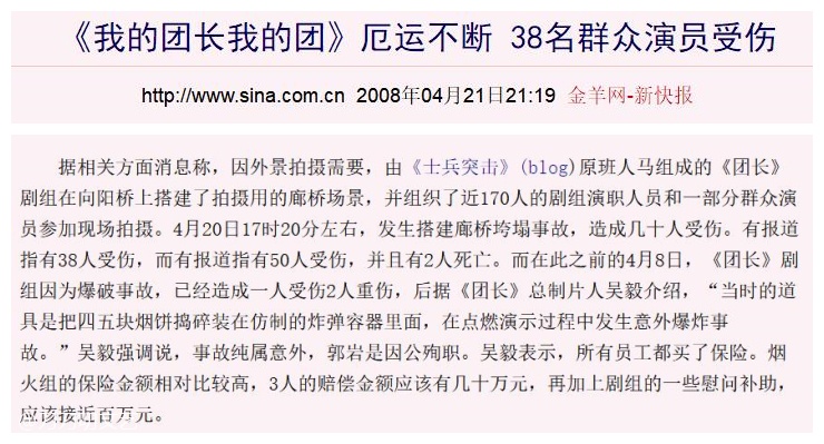 12天之后,剧组再度遭逢了廊桥垮塌事故,造成38名群众演员受伤。
