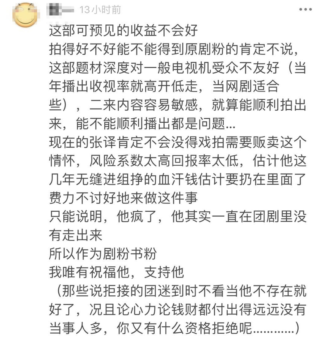 终章筹备的消息传出后,有双料剧粉书粉的网友说:“现在的张译肯定不会没戏拍,需要贩卖这个情怀,估计他这几年无缝进组挣的血汗钱要扔在里面了,只能说明他疯了,他其实一直没有走出来。所以,作为剧粉书粉,我唯有支持他、祝福他。”