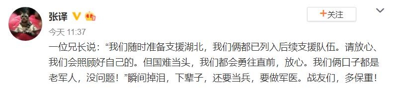 张译,今天中午发文,说自己下辈子还要当兵,并叮嘱驰援湖北抗疫一线的战友们多保重!