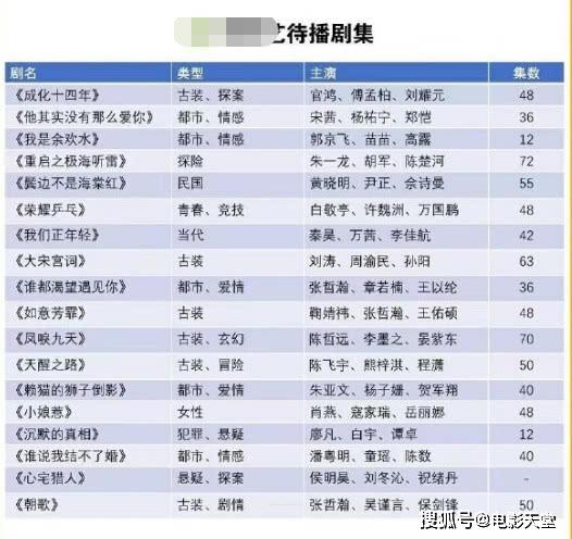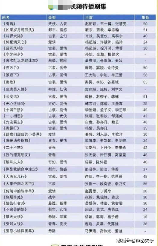 近日有网友整理出2020年各平台的待播电视剧在网络上引起吃瓜群众的围观,除了《有翡》、《青簪行》、《斗罗大陆》、《燕云台》、《狼殿下》在线观看(✪ω✪)等一些经常在网络上引起热议的电视剧外,一些名不见经传却实力不容小觑的剧集也被网友收集起来,快来看看有没有你想看?