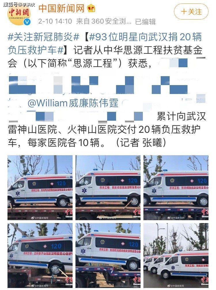 在武汉疫区齐力打造雷神山和火神山医院期间,陈伟霆与其他明星一块捐赠了20辆救护车。正因为有这么正能量的偶像,才影响了他的几百万粉丝,粉丝后援会也在不断集资,太让人感动。