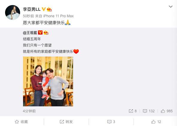 在王祖蓝晒出照片后,李亚男也随即转发,并写道“愿大家都平安健康快乐”。夫唱妇随联合秀恩爱的这种方式,也为情人节增添了不少浪漫氛围。从二人世界到三口之家,有了宝贝女儿Gabrielle的加入,也让两人未来所有的纪念日变得更有意义。