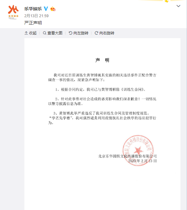 近日上海警方公布一起诈骗案件有网友爆出该起诈骗案主犯黄某竟然是乐华旗下艺人黄智博,简直让人无语至极!消息传来后网友们炸了锅,乐华公司则立马发布了一则声明谴责黄智博的行为并宣布解约。