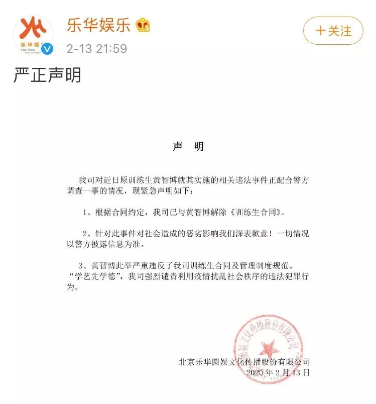 声明里表示和黄智博已解除了《训练生合同》,对于社会上造成的恶劣影响表示歉意,一切情况以警方披露的消息为准,最后还特别强调了 “学艺先学德”。