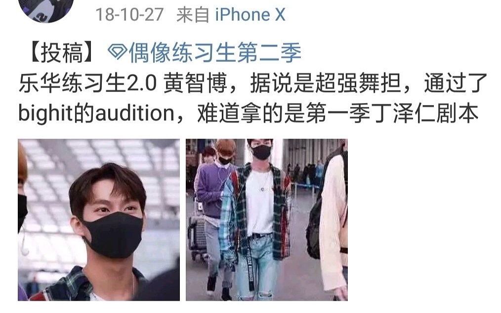 黄智博98年出生,长相属于清秀类型,早年曾在韩国Big Hit娱乐公司做练习生。