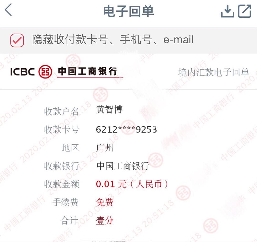 有的网友还特别皮,特意通过公开的银行卡账号打款,为了证实这个诈骗账号是黄智博,结果不出他们意料,收款人的名字确实是黄智博。