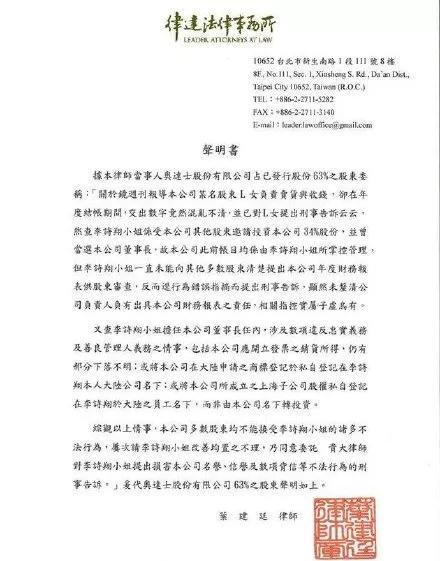据说明道经纪人李诗翔私自将公司在大陆申请的商标,登记在她自己的公司名下,而且一直没向其他股东提供公司财务报表审核,这次还恶人先告状。