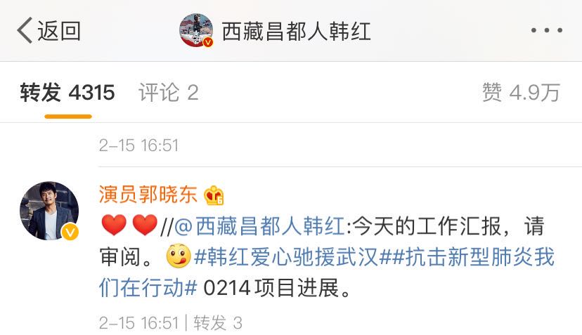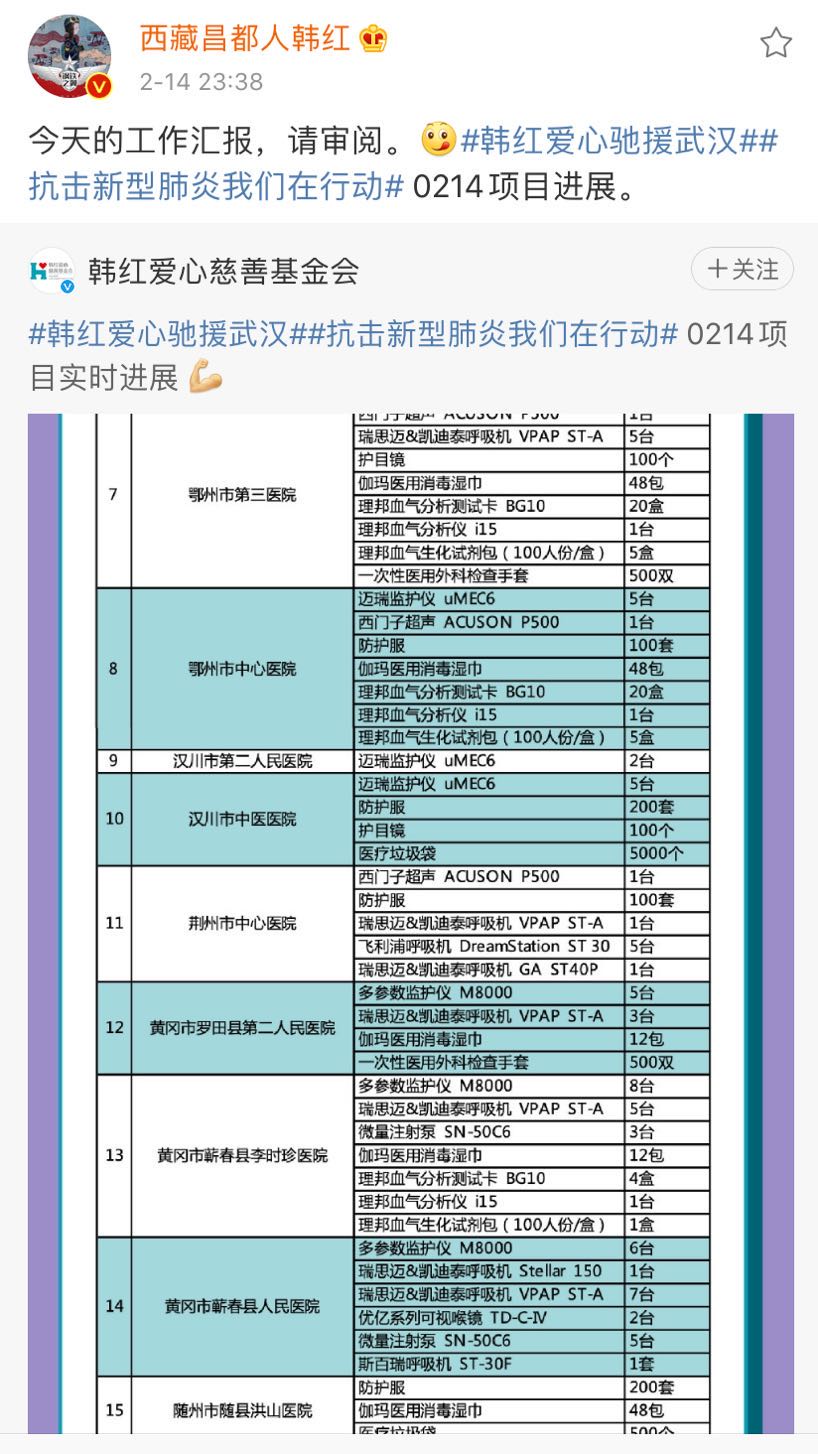 韩红几乎近期每一天都在微博发布捐赠医疗物资的进展情况,内容非常详实,大家可以看得清清楚楚,什么物资送到什么地方,数量是多少等等。
