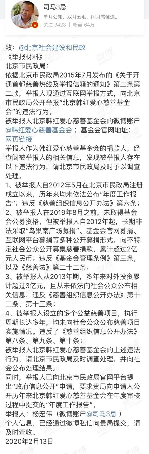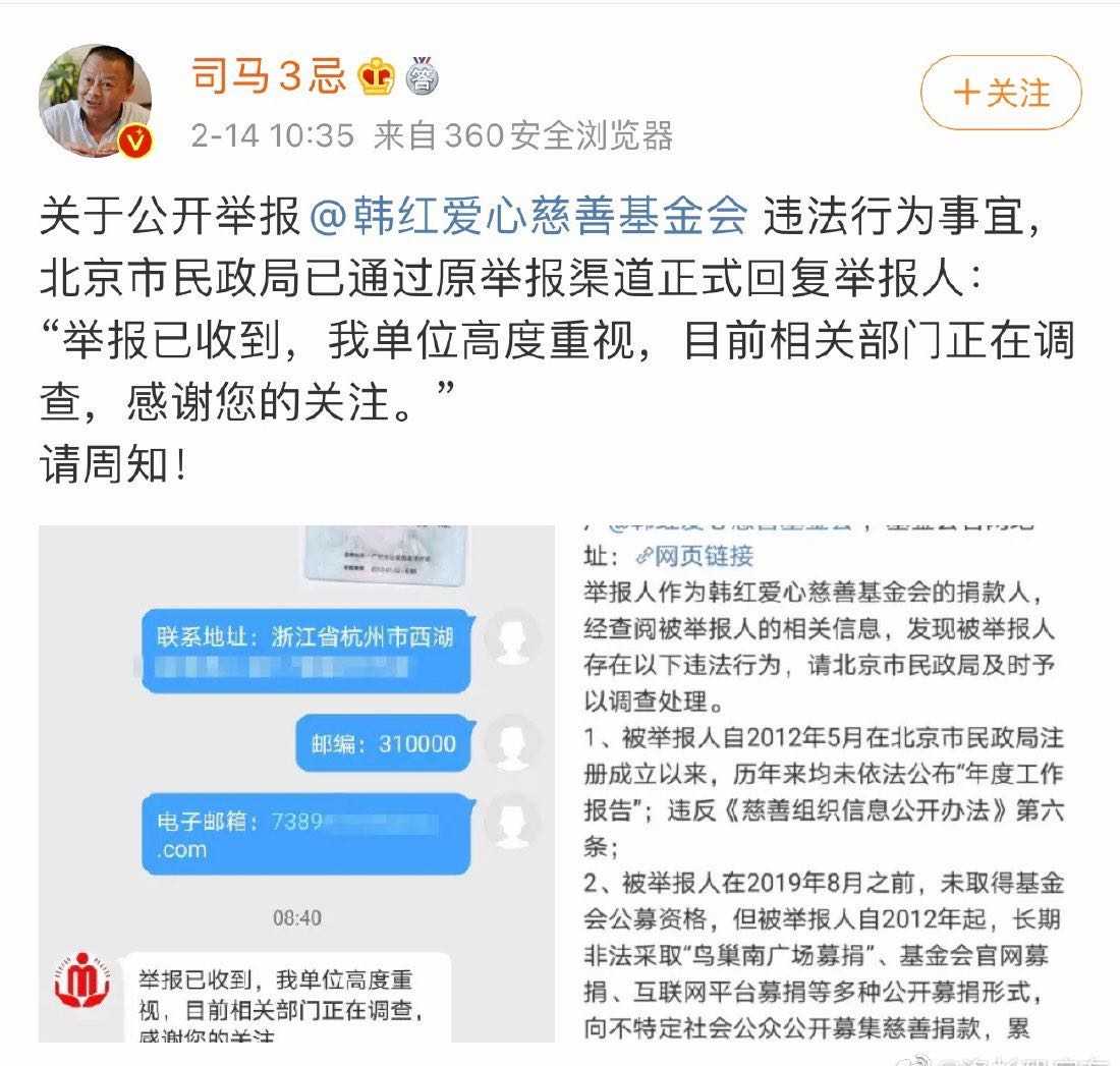 武汉发生新冠肺炎疫情,慈善明星韩红一直在进行募捐,捐款高达3亿停止捐款,因为要购买医疗物资送往湖北疫区。因为韩红的善举引发网友热议,结果有人扒出韩红基金会的一些过往信息,认为她没有被主管部门批准就进行募捐,还质疑韩红3亿资金去向不明,因为发现基金会的现金流量表投资收益栏有30多万的收入。实名举报,已经被接受,说是正在调查。