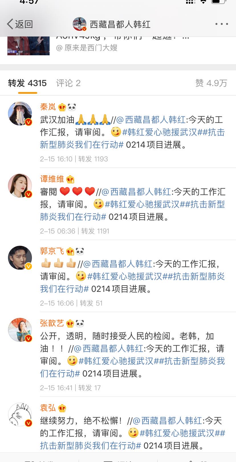 秦岚、谭维维、郭京飞、张歆艺、袁弘和郭晓东都纷纷发文力挺韩红,特别张歆艺还称,公开、透明,随时接受人民的检阅,老韩,加油!湖北武汉人袁弘也发文力挺韩红,继续努力,绝不松懈。曾与韩红到处采购医疗物资的郭晓东也发出两个爱心。这些明星都曾多次向韩红慈善基金会捐过款,应该很了解韩红的为人。