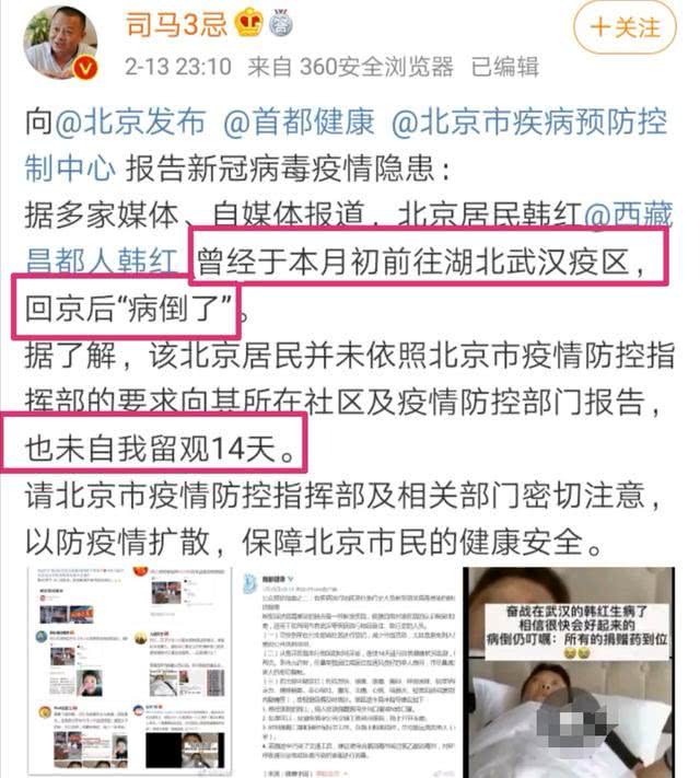 这位大V表示武汉早就封城,那韩红怎么从武汉出来又回到北京隔离的呢,大V表示“韩红就没去武汉”,