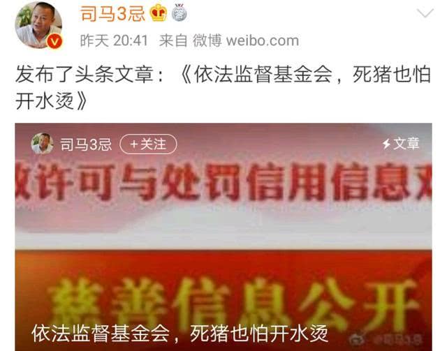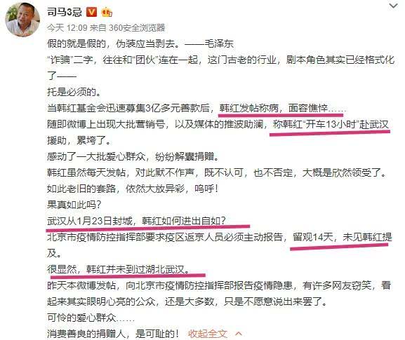 事情到了这里,网上突然出现了很多黑韩红慈善的留言,前几天,微博上的大V“司马3忌”接连炮轰韩红,严重质疑韩红基金的数据,
