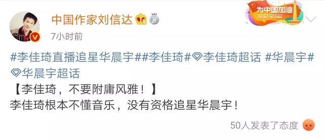 而刘信达则是动不动就让明星三个月内改正,不然就逐出娱乐圈的知名微博批评家。李佳琦向网友们说自己喜欢华晨宇的时候,他就说李佳琦不懂音乐,附庸风雅,并说让广大男性同胞管好自己老婆,别买李佳琦卖的东西。