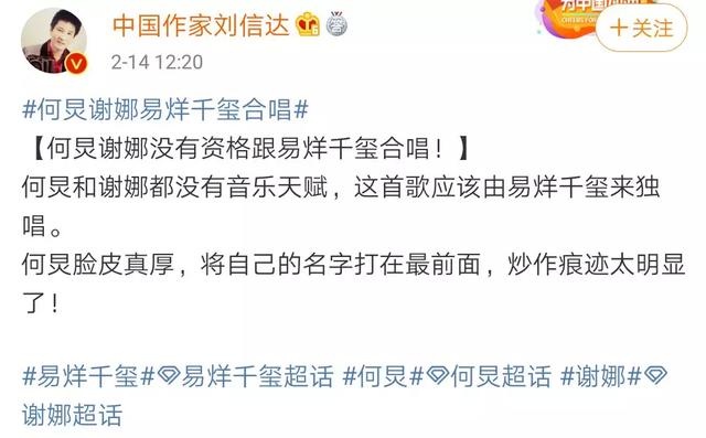 在刘信达看来,易烊千玺是专业歌手,何炅和谢娜都不行,和易烊千玺演唱就是脸皮厚,熟悉何炅和谢娜的都知道,他们出道时间都很早,而且这本来就是芒果台的节目,他们为节目宣传唱主题曲再正常不过了,况且两个我人都是唱歌功底不错的人。