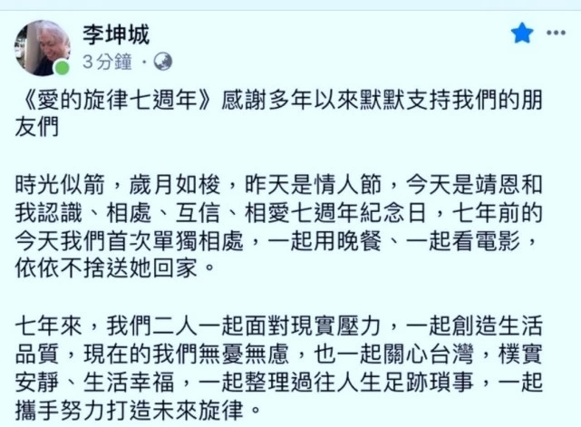 2月15日早上,63岁的音乐人李坤城趁着情人节气氛还在,在社交网向24岁女友林靖恩表白。